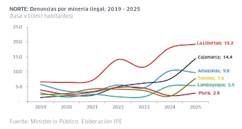 Este patrón se condice con el avance de la minería ilegal, actividad que suele articularse con redes de crimen organizado. En 2025, La Libertad registró 19,2 denuncias vinculadas a minería ilegal por cada 100 mil habitantes, casi el triple que en 2019 (6,6), y por encima del promedio nacional (16,5). Además, desde 2019 mantiene la mayor tasa de denuncias por minería ilegal entre las regiones del norte.