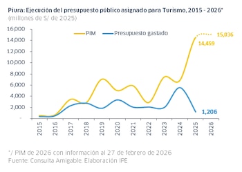 Las oportunidades para mejorar la conectividad y dinamizar el turismo tendrán un impacto limitado mientras Piura mantenga brechas de infraestructura y baja ejecución de inversión pública en el sector. En 2025, Piura contó con S/ 14,5 millones para turismo, más del doble que en 2024 (S/ 6,8 millones, a precios constantes) y el monto más alto de los últimos 10 años. Sin embargo, solo ejecutó 8,3% del total, muy por debajo del 81,7% de 2024. Esta baja ejecución se explica, en gran parte, por un proyecto que concentró cerca del 90% del presupuesto turístico regional: el mejoramiento de los servicios turísticos públicos en el malecón turístico Los Órganos (Talara), cuya ejecución fue nula. Además, Piura ha ejecutado sistemáticamente por debajo de su presupuesto en turismo durante los últimos siete años. En 2026, aunque el presupuesto del sector parece mantenerse relativamente constante, persiste el riesgo de una baja ejecución.