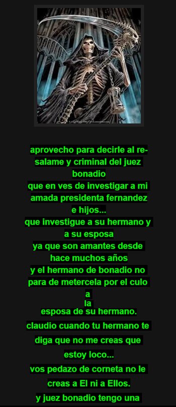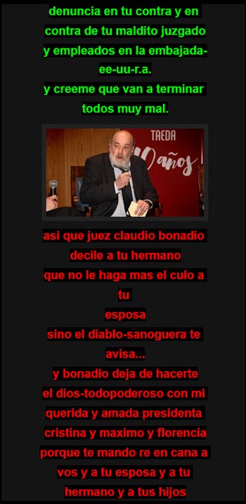 "Bonadio dejá de hacerte el dios-todopoderoso con mi querida y amada presidenta cristina y maximo y florencio porque te mando re en cana a vos y a tu esposa y a tu hermano y a tus hijos", afirma en el blog. Esas intimidaciones fueron distribuidas esta semana por correos electrónicos que llegaron a casillas del Senado y del Poder Judicial de la Nación.