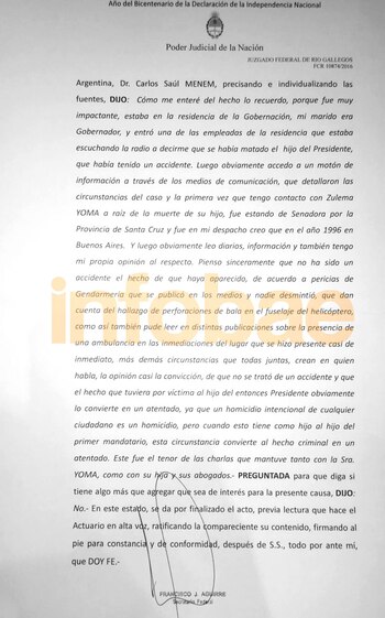 El acto procesal se realizó en los juzgados federales de Río Gallegos y la ex jefa de Estado pronunció una frase resonante: "Pienso sinceramente que no ha sido un accidente". Y luego de repasar las circunstancias extrañas que rodearon el episodio, sentenció: "Tengo casi la convicción de que no se trató de un accidente y que el hecho de que tuviera como víctima al hijo del Presidente lo convierte en un atentado".