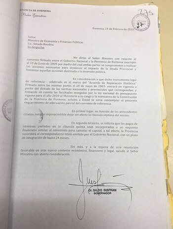 "Solicito a usted se sirva contemplar el presente requerimiento de adecuación parcial del convenio de referencia", arranca la carta enviada a Boudou en febrero de 2010. Son apenas cinco párrafos. Pero figura la firma del gobernador Insfrán.