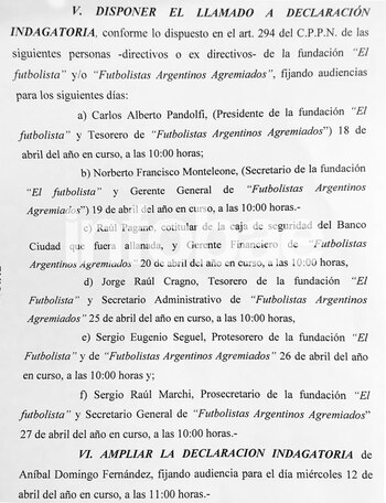 Según supo Infobae, la magistrada concretó en las últimas horas lo anunciado y llamó a indagatoria a Carlos Alberto Pandolfi (presidente de la fundación y tesorero de Agremiados), Norberto Francisco Monteleone, (secretario de la fundación y Gerente General de Agremiados), Raúl Pagano (Gerente Financiero de Agremiados), Jorge Raúl Cragno (tesorero de la fundación y Secretario Administrativo de Agremiados), Sergio Eugenio Seguel (Protesorero de la fundación y de Agremiados) y a Sergio Marchi (Prosecretario de la fundación y Secretario General de Agremiados). Todos los mencionados deberán comparecer ante la jueza a partir del 18 de abril. Además, Servini resolvió ampliar la declaración indagatoria del ex jefe de Gabinete Aníbal Fernández, quien deberá presentarse el día 12 de abril.