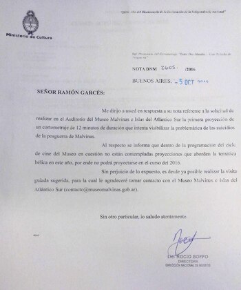 El film, protagonizado por el actor Fernando "Coco" Sily, quedó en medio de la polémica luego de que el Ministerio de Cultura rechazara un pedido para su proyección en el Auditorio del Museo Malvinas.