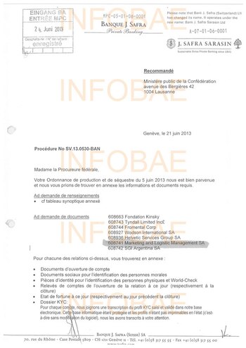 El primer documento es del banco Safra. "Su orden para la producción y secuestro del 5 de junio de 2013 nos ha llegado y usted encontrará en anexo las informaciones y documentos requeridos", señala la carta firmada por Elie Sasson y Roland Muller, de la entidad bancaria.