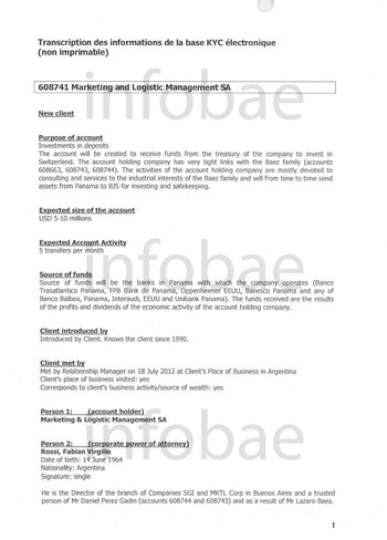 El banco vincula directamente a Rossi con Báez: "Él es el director de la sucursal argentina de las compañías SGI y Marketing y una persona de confianza de Daniel Pérez Gadín (cuentas 608744 608743) como resultado de su conocimiento de Lázaro Báez".