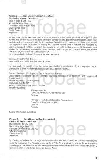 Sobre Cesar Fernández el informe señala que es una persona con experiencia en el mercado financiero en Argentina que por su "conocimiento ha ayudado a la familia Báez a operar comercialmente en Panamá y en Marketing y Logistic y desempeñó un rol clave en el proceso".