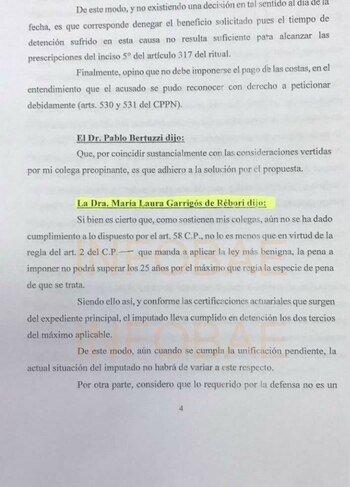 La Cámara Criminal y Correccional rechazó el pedido de excarcelación del represor, pero hubo un voto en disidencia que se apartó del criterio general y se pronunció a favor de aplicar el 2×1. Fue el de la jueza María Laura Garrigós de Rébori, actualmente presidente de la agrupación Justicia Legítima.