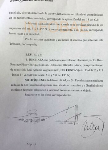 En su fallo, la magistrada sostuvo que Guglielminetti -condenado por secuestros y torturas- había cumplido los dos tercios de la pena debiendo aplicarse el 2 por 1 por tratarse de la ley penal más benigna. Y agregó: "Considero que lo requerido por la defensa no es un beneficio sino un derecho".