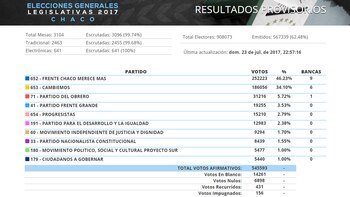 Con el 99,74 por ciento de las mesas escrutadas, la lista del PJ, que respaldaron el gobernador Domingo Peppo y el exjefe de Gabinete y actual intendente de Resistencia, Jorge Capitanich, reunía el 46,23 por ciento de los votos, seguido por Cambiemos con una cosecha de 34,10 por ciento de los sufragios y en tercer lugar se ubicaba el Partido Obrero, con el 5,72 por ciento.