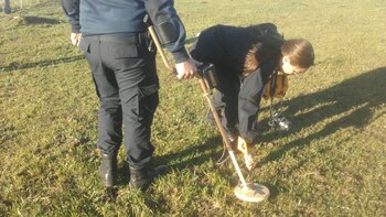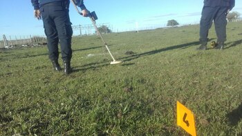 Efectivos de la Policía de la Provincia de Buenos Aires con detectores de metales participan de un procedimiento en un propiedad del "Pata" Medina buscando dinero que el sindicalista habría enterrado. El dato, brindado por un supuesto arrepentido, desembocó en el operativo, que se realiza en una quinta de la localidad de Pipinas, en el distrito bonaerense de Punta Indio.