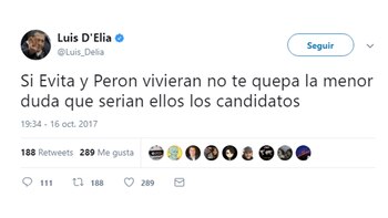 Cristina Kirchner había dicho que si Evita y Perón vivirían, votarían por ella y por Taiana, ante lo que D´Elía tuiteó: "Si Evita y Peron vivieran no te quepa la menor duda que serian ellos los candidatos".