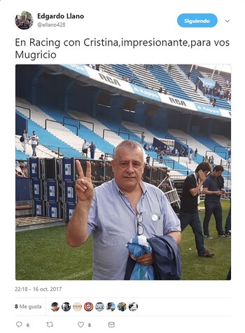 "En Racing con Cristina, impresionante", comienza el tuit de Edgardo Llano, secretario general de la Asociación del Personal Aeronáutico (APA). Pero no termina allí, sino que continúa con una dedicatoria especial: "Para vos, Mugricio". ¿El destinatario evidente? El presidente Mauricio Macri.