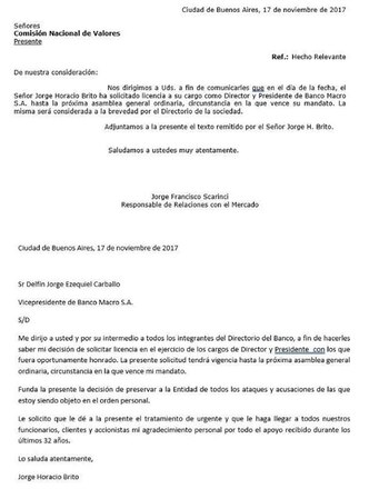 Scarinci remitió a la CNV la misiva que Brito había enviado al Directorio del Macro, en la que explicó que decidió tomar licencia para preservar a la entidad bancaria "de todos los ataques y acusaciones de las que estoy siendo objeto en el orden personal".