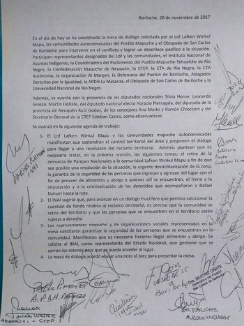 Pero a pesar de la intención de dialogar, lo firmado por los mapuches sostiene que "el Lof Lafken Winkul Maipu y las comunidades mapuches autoconvocadas manifiestan que sostendrán el control territorial del área y proponen el diálogo para llegar a una resolución del reclamo territorial".