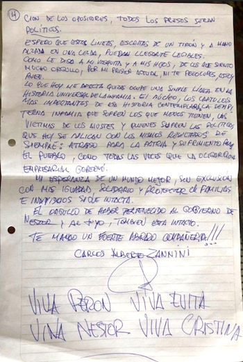 La propia ex mandataria y actual senadora exhibió la carta, la que le fue entregada en mano por "Franco y Carlitos", los hijos del ex funcionario K detenido en el penal de Ezeiza, en el marco de la causa que investiga el presunto encubrimiento de los iraníes acusados del atentado a la AMIA.