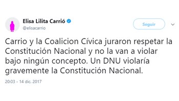 Luego de que se filtrara esa información, Elisa Carrió usó sus redes sociales para advertirle al oficialismo que ella no está dispuesta a apoyar esa decisión: "Carrio y la Coalición Cívica juraron respetar la Constitución Nacional y no la van a violar bajo ningún concepto. Un DNU violaría gravemente la Constitución Nacional".