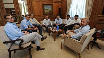 También estuvieron en el despacho de Frigerio en la planta baja de la Casa de Gobierno Eduardo "Bali" Bucca, ex intendente de Bolívar y actual diputado nacional, y Mariano Cascallares, intendente de Almirante Brown.