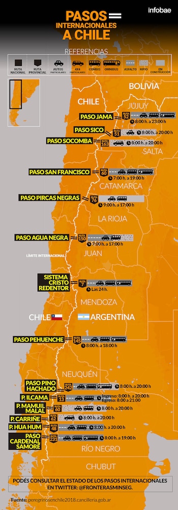 Es por este motivo que el Ejecutivo dispuso una mesa de trabajo interministerial para coordinar los operativos de emergencia y seguridad junto al Gobierno de Chile, integrado por funcionarios de Seguridad, Transporte, Interior, Jefatura de Gabinete y Cancillería, entre otras dependencias oficiales como Migraciones y Aduana. "Nosotros tenemos la obligación de prever que serán un millón de personas. Tenemos la cantidad de funcionarios para reforzar todos los puestos fronterizos, además del apoyo logístico de las provincias, que aportarán ambulancias y puestos sanitarios", aseguró a Infobae una fuente calificada del Ministerio del Interior, a cargo de Rogelio Frigerio.