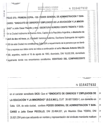 Para la Justicia no hay dudas: Mauricio Yebra ingresó en 2012 al directorio del Sindicato de Obreros y Empleados de la Minoridad y la Educación (SOEME) y se convirtió en un testaferro del gremialista Marcelo Balcedo y su mujer, con quienes conformó una asociación ilícita para apropiarse del dinero de los afiliados. En su procesamiento, el juez Ernesto Kreplak enumeró todas las pruebas contra el único de los tres detenidos que está en el país. La principal sigue siendo el retiro, en efectivo, de unos $80 millones de una cuenta bancaria del gremio, entre enero de 2012 y diciembre de 2013. Los movimientos nunca se justificaron y el dinero habría terminado en vehículos, embarcaciones e inmuebles. La maniobra fue posible gracias a un poder de administración (ver imagen) que el otorgó Balcedo. La Justicia también investiga un total de 18 vuelos privados de Yebra a Uruguay, durante 2014, en los que se podría haber trasladado dinero en efectivo.