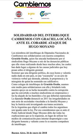 Los miembros del interbloque de diputados de Cambiemos se solidarizaron con su compañera Graciela Ocaña, quien aseguraron fue "atacada burdamente" por el sindicalista Hugo Moyano a raíz de las denuncias públicas que ella viene realizando desde hace años contra el dirigente