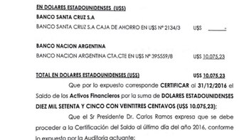 Así lo evidenció el Tribunal de Cuentas de la provincia, al certificar la rendición de los Activos Extrapresupuestarios a diciembre de 2016. Precisamente, en la Cuenta Corriente del Banco de la Nación Argentina, N° 395559/8 (Sucursal Plaza de Mayo) hay un saldo de USD 10.231,23. A esa cifra se le restan USD 156 por Comisiones Bancarias, lo que arroja un saldo de USD 10.075,23.