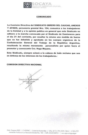 La explicación del gremio del caucho es muy simple: "Por resultar la misma una medida de fuerza que no fue debatida y aprobada en los cuerpos orgánicos de la Confederación General del Trabajo de la República Argentina, resultando la misma meramente personalista por quien fuera el promotor y convocante, Hugo Moyano".