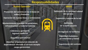 Además, entre las responsabilidades que tendrá el nuevo operador se destaca la de absorber al personal en relación de dependencia afectado al servicio (exceptuando cargos gerenciales). Tendrá también a su cargo el mantenimiento y gestión de estaciones, infraestructura y material rodante, mientras del lado de Sbase quedará por ejemplo definir la tarifa del usuario.