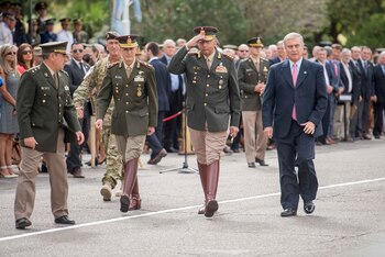 El acto arrancó cinco minutos después de la hora anunciada cuando pasó revista a las tropas el ministro Aguad. Ya en su sitio, un ayudante de campo leyó la trayectoria del Teniente General Suñer, promoción 1981. Escuchaban, entre otros, el secretario de Derechos Humanos, Claudio Avruj; el ex jefe del Ejército General Martín Balza, retirados, familiares, representantes extranjeros y hasta empresarios entre los que se vio a Cristiano Rattazzi.