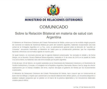 Lo hizo a través de una comunicado que tiene fecha de este martes y está firmado por el Ministerio de Relaciones Exteriores del país vecino. En el texto, la cartera asegura que solo recibieron "una nota verbal de la Embajada Argentina en La Paz, como un planteamiento general sobre la intención de 'suscribir un convenio'".