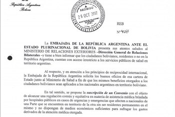 Para ello, la Embajada Argentina en La Paz le envió una nota formal a la Cancillería boliviana con el objetivo de "alcanzar una regulación común y equitativa en materia de asistencia médica brindada por hospitales públicos en casos de urgencias y emergencias".