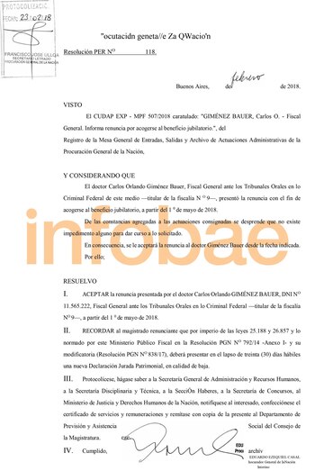 La renuncia se hará efectiva recién el 1 de mayo y ya fue aceptada por el procurador general Eduardo Casal. Pero la situación genera muchas dudas por las circunstancias en las que ocurre. Giménez Bauer acababa de pasar al fuero federal y ni siquiera llegó a debutar. "Ya estaba en edad de jubilarse. No iba a poder hacerlo en medio de un mega juicio", advierten en Comodoro Py para intentar explicar los motivos de su salida.