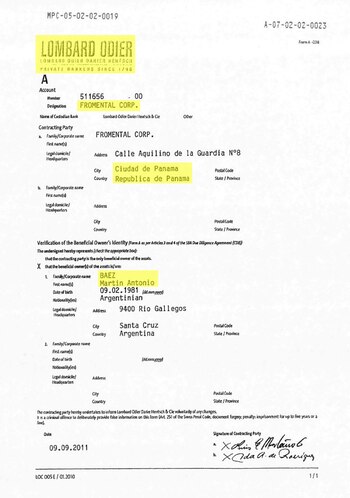 Para concretar la operación, uno de los requisitos formales del banco Lombard Odier fue una descripción de los propósitos de la cuenta, y en este punto la familia Báez hizo una llamativa aclaración: lo presentan a Báez como "allegado al ex anterior presidente argentino Kirchner".