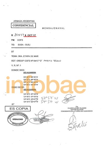 Y finaliza: "Esto es así porque la anotación adolecía de errores al momento de determinar el área de operaciones. El mensaje naval oficial se encuentra en manos del Poder Judicial de la Nación y determina el área Alejandra de modo preciso, sin raspaduras, tachaduras ni enmiendas y con el número electrónico de transmisión que automáticamente asigna el sistema de comunicaciones navales (CESU17A0022 552/ 117)"