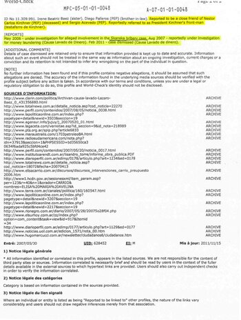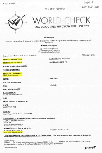 La organización que se refiere a Lázaro Baéz como "testaferro" del ex presidente se llama World Check y depende de Thomson Reuters. Se trata de una base de datos internacional que recoge información sensible de Personas Políticamente Expuestas (PPP) y que es consultada por los bancos de todo el mundo cuando algún cliente pretende abrir una cuenta en la entidad. El objetivo es reducir los riesgos de sufrir algún delito financiero.