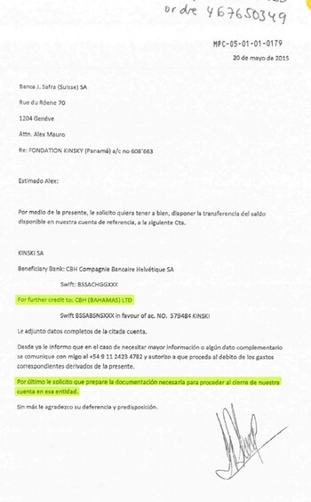 Casanello también recibió información sobre el cierre de la cuenta 608663 perteneciente a la Fundación Kinski, el 20 de mayo de 2015. Martín Báez, hijo mayor de Lázaro, pidió la transferencia del saldo total y disponible de la cuenta a un banco de las islas Bahamas. Después, solicitó el cierre formal de la cuenta.