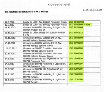En diciembre de 2012, se realizaron dos giros de la Fundación Kinsky hacia la Helvetic Services Group. Son de 5 millones de dólares cada uno.