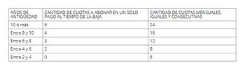Tendrá derecho a la percepción de una suma no remunerativa al finalizar su relación de empleo conforme la antigüedad que registre, más cierta cantidad de cuotas conforme a dicha antigüedad, las que se abonarán de manera mensual y consecutiva.