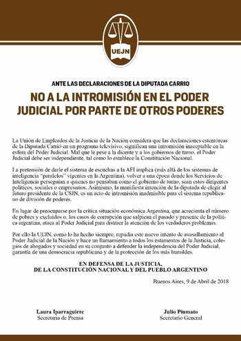 "En lugar de preocuparse por la crítica situación económica argentina, que acrecienta el número de pobres y excluidos o, los casos de corrupción que salpican el pasado y presente de la política argentina, ataca al Poder Judicial para distraer la atención de los verdaderos problemas", aseguró el comunicado firmado por Piumato y por la secretaria de prensa de la UEJN, Laura Iparaguirre.
