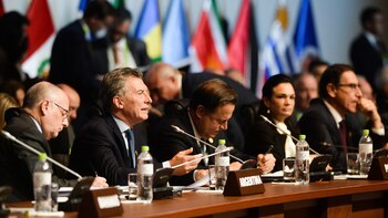 El Jefe de Estado llegó ayer a Lima acompañado por la primera dama, Juliana Awada, y participó del acto de apertura de la Cumbre en el Gran Teatro Nacional donde el presidente de Perú, Martín Vizcarra, dio la bienvenida a las delegaciones y pronunció el discurso inaugural.
