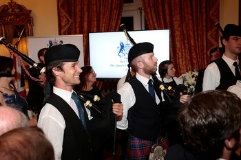 "God save the queen". Serio y con un scotch en su mano en alto el embajador Mark Kent brindó por el Día Nacional británico, que es el festejo por el cumpleaños de la Reina Isabel II. Antes brindó por el Presidente argentino y por el pueblo argentino con una copa de malbec que saboreó apenas mojando sus labios después de que una banda de la Fuerza Aérea ejecutara fragmentos de los himnos de ambas naciones.