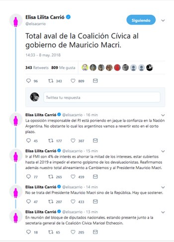 Luego del anuncio de Mauricio Macri sobre iniciar negociaciones con el Fondo Monetario Internacional (FMI), Elisa Carrió salió rápidamente en las redes sociales a apoyar el discurso del Presidente.