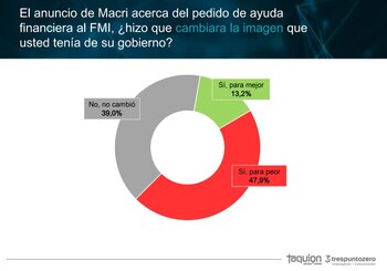 "El anuncio de Macri acerca del pedido de ayuda financiera al FMI, ¿hizo que cambiara la imagen que usted tenía de su gobierno?", fue otra de las preguntas que se hicieron. "Sí, para peor", respondieron el 47,9% de los encuestados. En un 39% el aviso no tuvo ningún impacto. Solo un 13,2% declaró que la noticia favoreció la imagen de la Rosada.