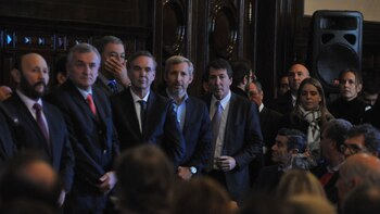 Lo escuchaban atentos el presidente de la Corte Suprema, Ricardo Lorenzetti, y los jueces federales Claudio Bonadio, Daniel Rafecas, Ariel Lijo, Rodolfo Canbioba Corral, Mariano Borisnky y Martínez de Giorgi, entre otros. También estaban los gobernadores Horacio Rodríguez Larreta (CABA), Gerardo Morales (Jujuy), María Eugenia Vidal (Buenos Aires), Alberto Weretineck (Río Negro), Gildo Insfrán (Formosa), Sergio Uñac (San Juan), Juan Schiaretti (Córdoba) y Miguel Lisfschiz (Santa Fe).