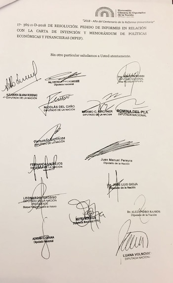 El pedido fue realizado en una carta dirigida al presidente de la Cámara de Diputados de la Nación, Emilio Monzó, que fue firmada por los diputados del bloque Frente para la Victoria-PJ Agustín Rossi, Máximo Kirchner, Fernando Espinoza, Fernanda Vallejos, José Luis Gioja, Mayra Mendoza, Alejandro Ramos, Adrián Grana y Luana Volnovich; del bloque Peronismo para la Victoria , Leonardo Grosso; del Frente de Izquierda, Romina del Pla y Nicolás del Caño; del bloque Nuevo Espacio Sanafesino, Alejandra Rodenas, y de Concertación Forja, Juan Manuel Pereyra.