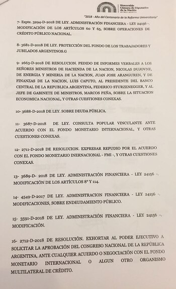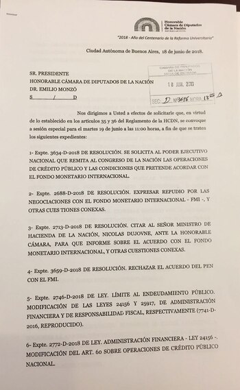 Los legisladores pidieron una sesión especial para el martes 19 de junio a las 11 de la mañana y adelantaron que, si se lleva a cabo, rechazarán las negociaciones entre el gobierno de Mauricio Macri y el FMI. También pidieron tratar el límite al endeudamiento público y la modificación de las leyes de administración financiera y de responsabilidad fiscal. Además, solicitaron la presencia del ministro de Hacienda, Nicolás Dujovne, para que explique los pormenores del acuerdo.