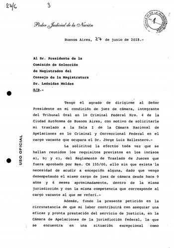 Así se puso en marcha el plan B. Bertuzzi envió este miércoles una nota al Consejo de la Magistratura de la Nación en la que pidió su traslado definitivo a la vacante que dejó Ballestero en la Sala I de la Cámara Federal, que es donde están Bruglia y Llorens. Irurzun es de la Sala II.