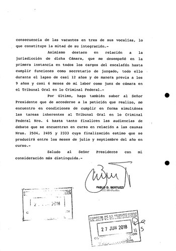 En esa nota, a la que accedió Infobae, Bertuzzi sostuvo que contaba con los requisitos para el traslado, que conoce el fuero federal porque se desempeñó por todos los escalafones de la carrera judicial y es juez desde hace nueve años y medio y que la Cámara Federal se encuentra "en una situación excepcional" por las vacantes que tiene.