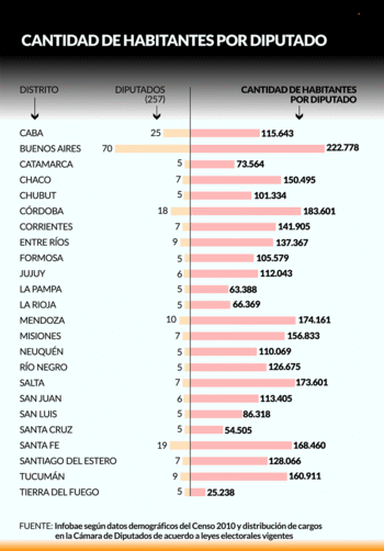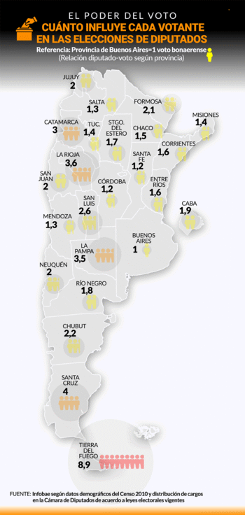Con las reglas de juego vigentes, sin ponderar el padrón de votantes registrados, un diputado nacional por la Provincia de Buenos Aires representa a 222.778 habitantes, mientras que en Tierra del Fuego hay un legislador cada 25.238. Uno de Santa Cruz, en tanto, refleja la voluntad de 54.505, una ecuación de 4 a 1 con respecto a los de la provincia de María Eugenia Vidal.