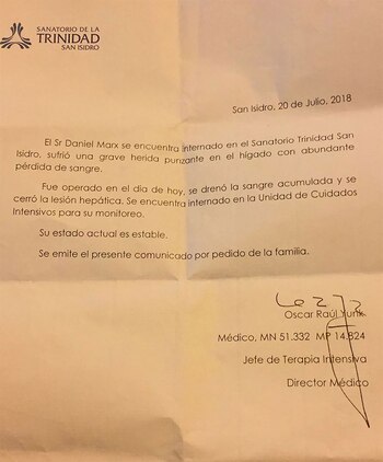 Marx perdió mucha sangre y quedó internado en el Sanatorio de la Trinidad de San Isidro. En un comunicado se informó que "sufrió una grave herida punzante en el hígado con abundante pérdida de sangre".