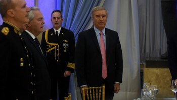 En la cena de las Fuerzas Armadas acompañaron a Macri el jefe de Gabinete, Marcos Peña, y los ministros de Defensa, Oscar Aguad, de Seguridad, Patricia Bullrich, el secretario de Derechos Humanos, Claudio Avruj, y el ministro de Ciencia, Tecnología e Innovación Productiva, Lino Barañao.